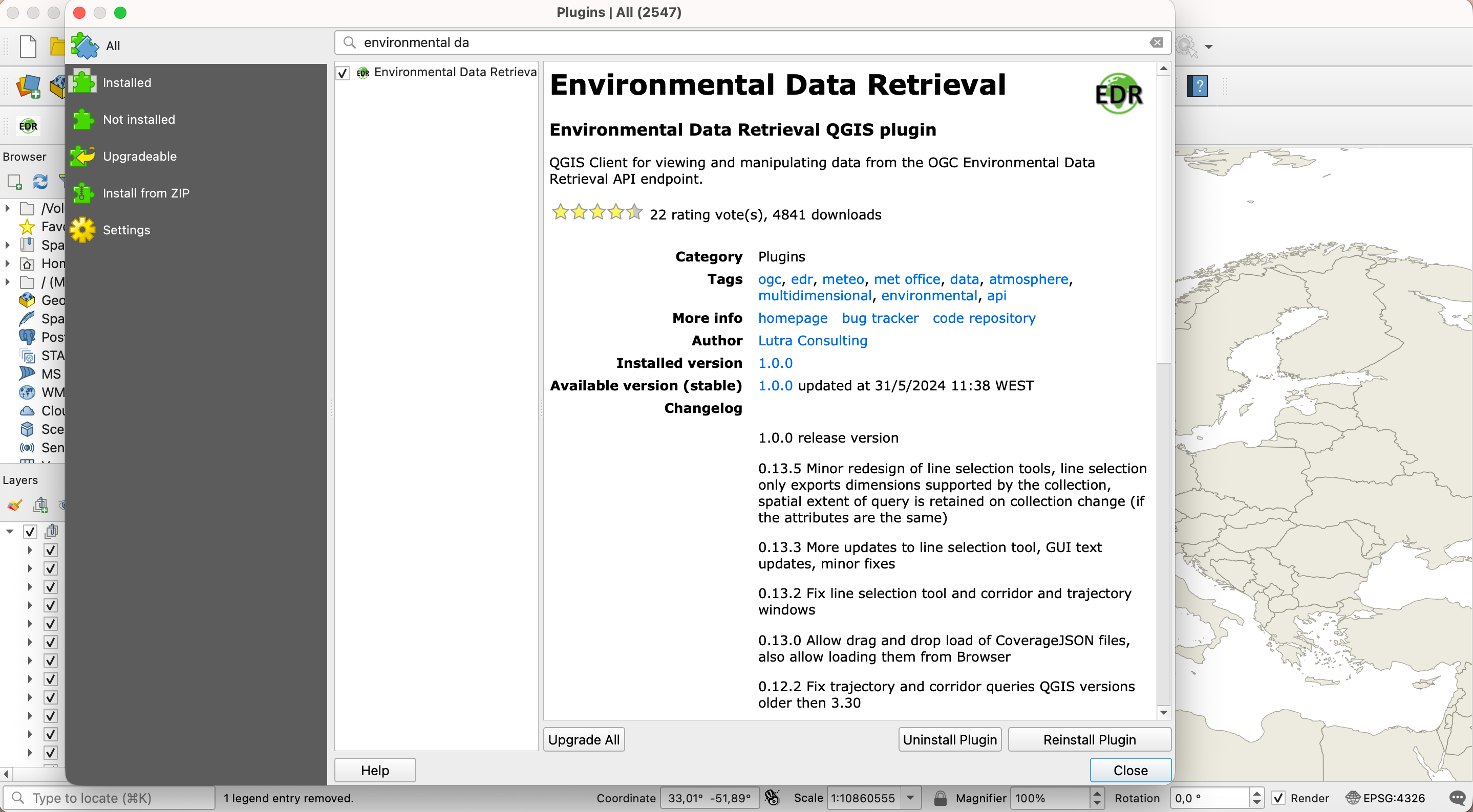 O QGIS dá suporte à OGC API - EDR através do plugin EDR. Pode instalar-lo directamente através do Hub de plugins do QGIS, indo a Plugins->Gerir e instalar Plugins no menu de topo.