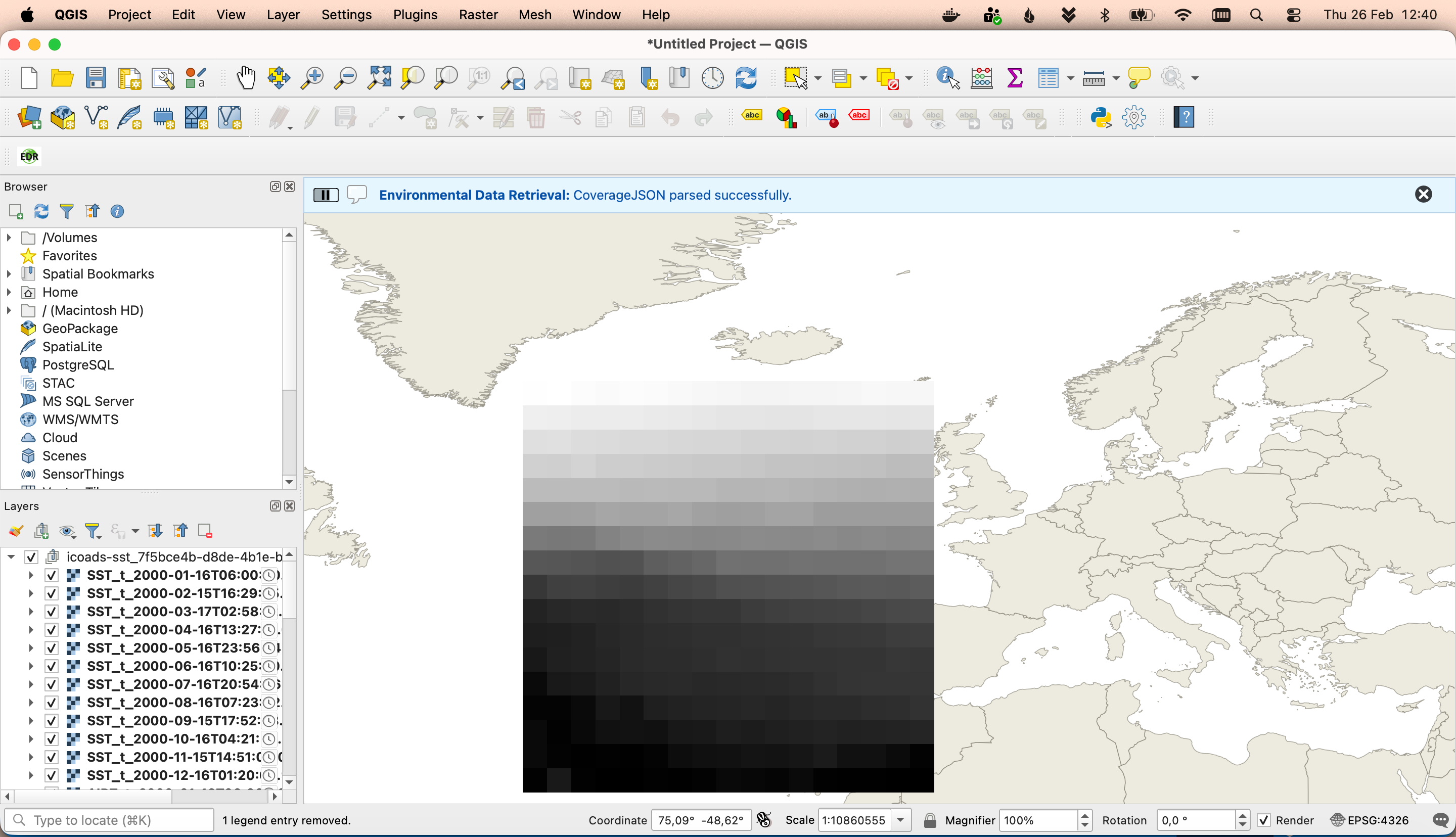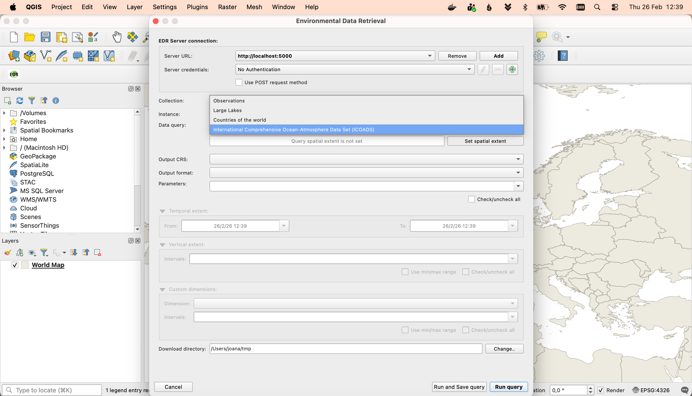 A combo box será populada com todas as coleções disponiveis naquele servidor. Seleccione a coleção EDR: International Comprehensive Ocean-Atmosphere Data Set (ICOADS).