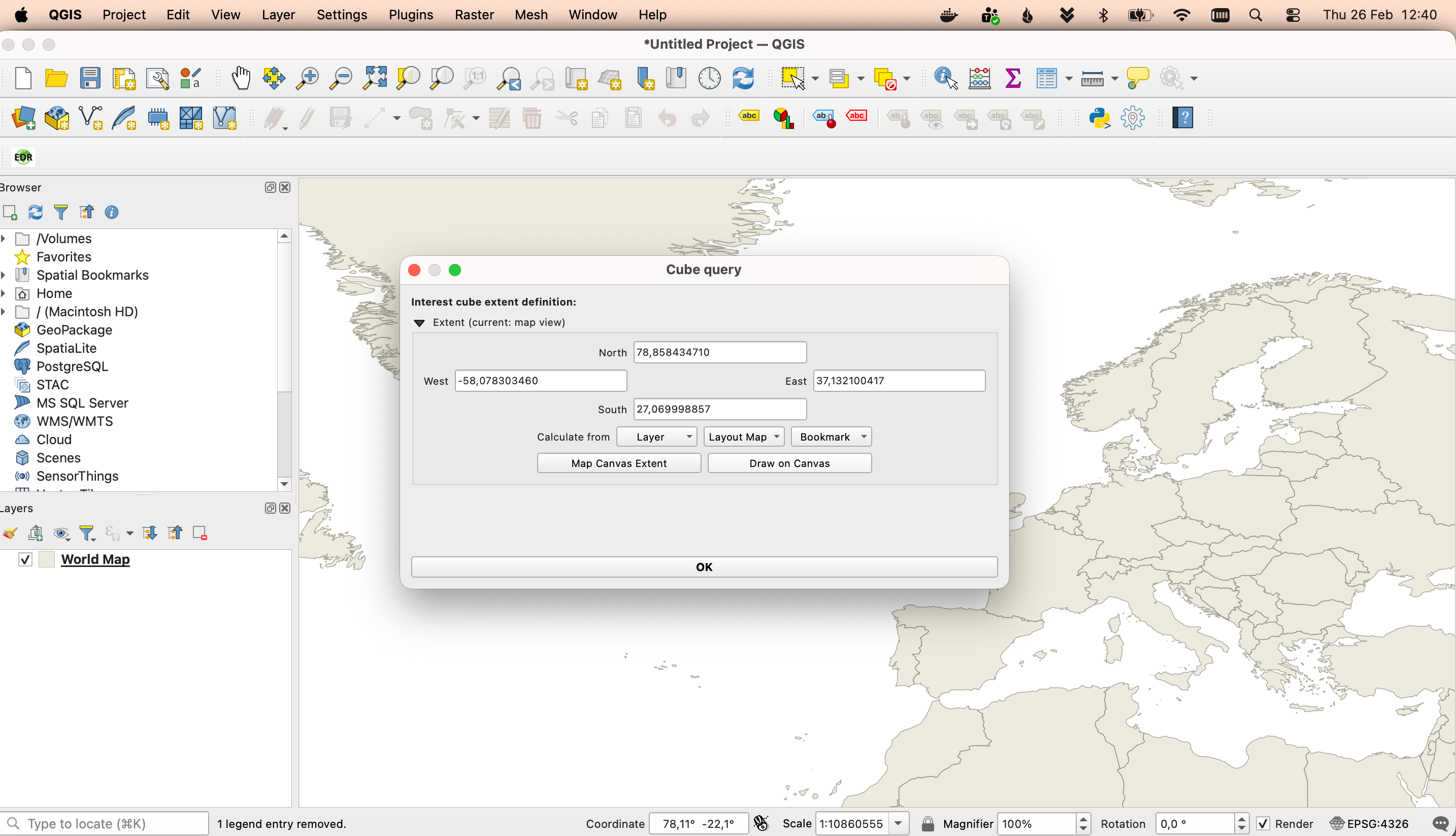 A combo box de query de dados será populada com os tipos de query de dados disponiveis para esta coleção, neste caso: posição e cubo. Pode seleccionar a query do tipo cubo e carregar no botão que permite definir a extensão espacial da query. Um novo diálogo irá abrir, mostrando as diferentes opções para definir a extensão espacial. Pode escolher Desenhar no canvas, para desenhar um rectângulo no extent da map view.